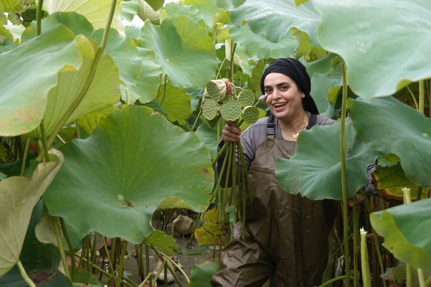 中外学生实践团一行还将亲手采摘的新颖莲蓬、荷花打包运往奉化从城区进行爱心义卖,如许的场景,正在教员傅的帮帮下,中外学生一个个蠢蠢欲动,来自苏丹的“05后”留学生泽娜·赛义德第一个“全副武拆”下塘,熬炼我的通俗话,体验“采莲人”的一天。